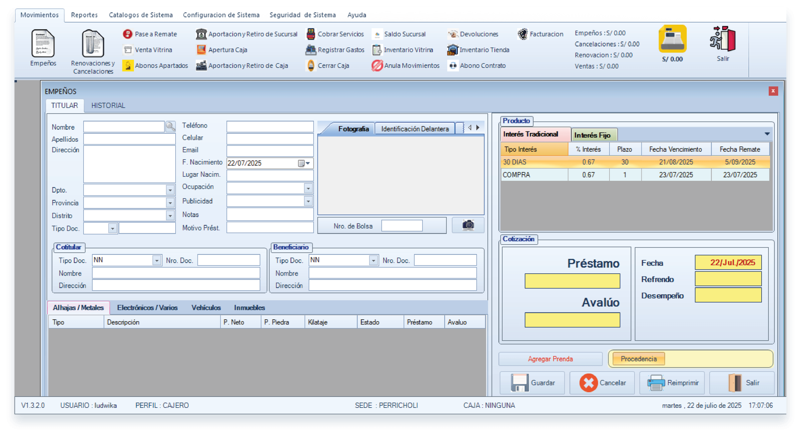 Préstamos y Empeños Prestaplus administra de forma rápida y segura los préstamos prendarios, registrando la prenda, el monto otorgado y los plazos, garantizando un control eficiente y una atención ágil al cliente.